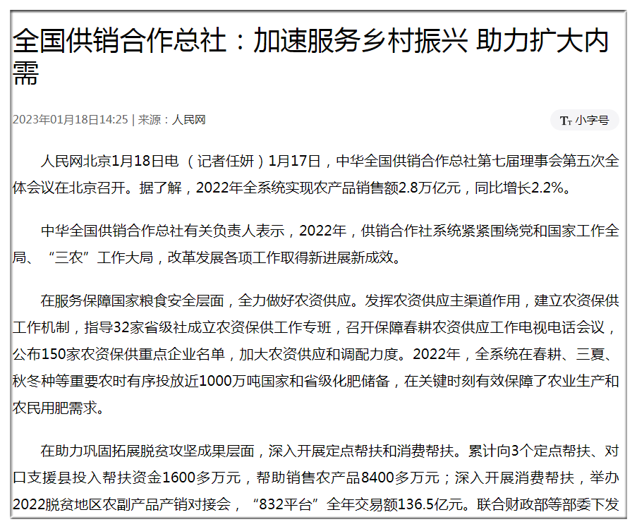 1月17日,中華全國供銷合作總社第七屆理事會第五次全體會議在北京召開。據(jù)了解,2022年全系統(tǒng)實(shí)現(xiàn)農(nóng)產(chǎn)品銷售額2.8萬億元,同比增長2.2%。