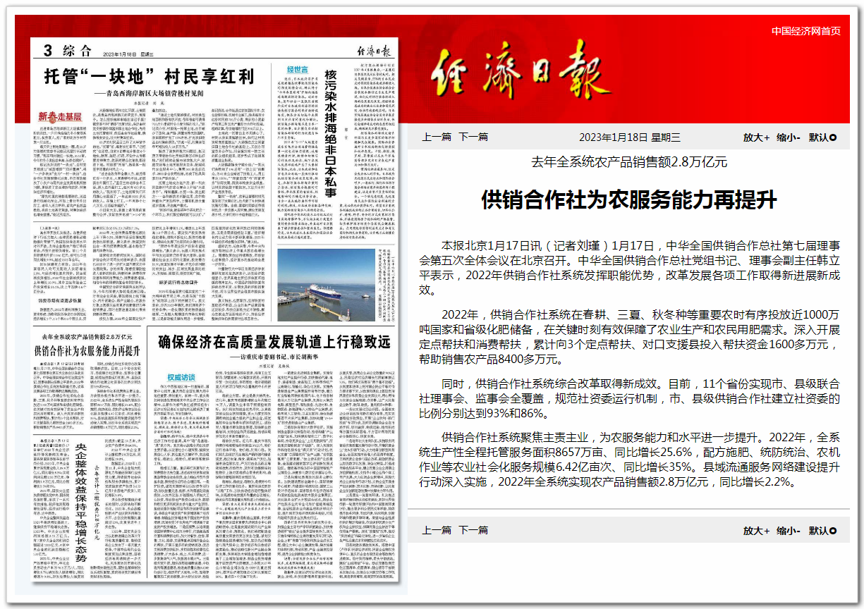 1月17日,中華全國供銷合作總社第七屆理事會第五次全體會議在北京召開。中華全國供銷合作總社黨組書記、理事會副主任韓立平表示,2022年供銷合作社系統(tǒng)發(fā)揮職能優(yōu)勢,改革發(fā)展各項(xiàng)工作取得新進(jìn)展新成效。