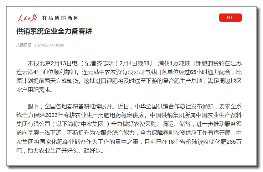 眼下,全國各地春耕備耕陸續(xù)展開。近日,中華全國供銷合作總社發(fā)布通知,要求全系統(tǒng)全力保障2023年春耕農(nóng)業(yè)生產(chǎn)用肥用藥穩(wěn)定供應(yīng)。中國供銷集團(tuán)所屬中國農(nóng)業(yè)生產(chǎn)資料集團(tuán)有限公司(以下簡稱“中農(nóng)集團(tuán)”)全力做好農(nóng)資采購、調(diào)運(yùn)、儲(chǔ)備,進(jìn)一步推動(dòng)服務(wù)渠道向基層一線下沉,不斷提升為農(nóng)服務(wù)綜合能力,全力保障春耕農(nóng)資供應(yīng)工作有序開展。中農(nóng)集團(tuán)將國家化肥商業(yè)儲(chǔ)備作為工作的重中之重,目前已在18個(gè)省份陸續(xù)收儲(chǔ)化肥265萬噸,助力農(nóng)業(yè)生產(chǎn)開好頭、起好步。
