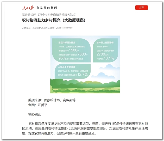 今年初,《中共中央 國務院關(guān)于做好2023年全面推進鄉(xiāng)村振興重點工作的意見》提出,加快完善縣鄉(xiāng)村電子商務和快遞物流配送體系,建設縣域集采集配中心,推動農(nóng)村客貨郵融合發(fā)展,大力發(fā)展共同配送、即時零售等新模式,推動冷鏈物流服務網(wǎng)絡向鄉(xiāng)村下沉。