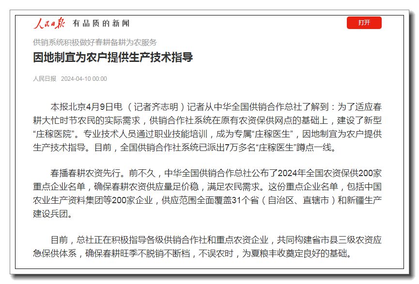 目前,總社正在積極指導(dǎo)各級(jí)供銷合作社和重點(diǎn)農(nóng)資企業(yè),共同構(gòu)建省市縣三級(jí)農(nóng)資應(yīng)急保供體系,確保春耕旺季不脫銷不斷檔,不誤農(nóng)時(shí),為夏糧豐收奠定良好的基礎(chǔ)。
