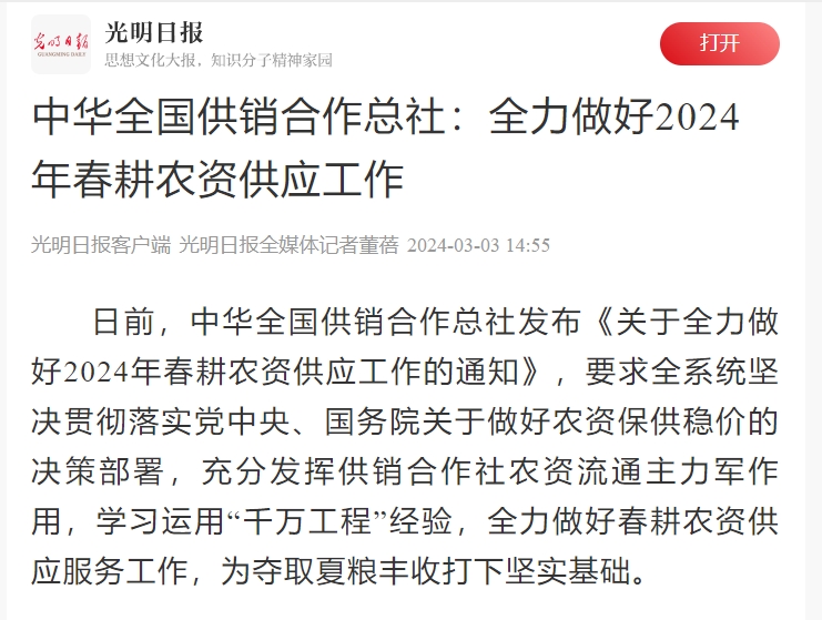 日前,中華全國供銷合作總社發(fā)布《關(guān)于全力做好2024年春耕農(nóng)資供應(yīng)工作的通知》,要求全系統(tǒng)堅(jiān)決貫徹落實(shí)黨中央、國務(wù)院關(guān)于做好農(nóng)資保供穩(wěn)價(jià)的決策部署,充分發(fā)揮供銷合作社農(nóng)資流通主力軍作用,學(xué)習(xí)運(yùn)用“千萬工程”經(jīng)驗(yàn),全力做好春耕農(nóng)資供應(yīng)服務(wù)工作,為奪取夏糧豐收打下堅(jiān)實(shí)基礎(chǔ)。